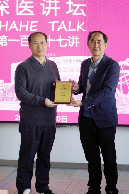 Professor Peng Huang presented Professor Xuehai Yan with the "Shenzhen University Medicine Forum" Honorary Medal