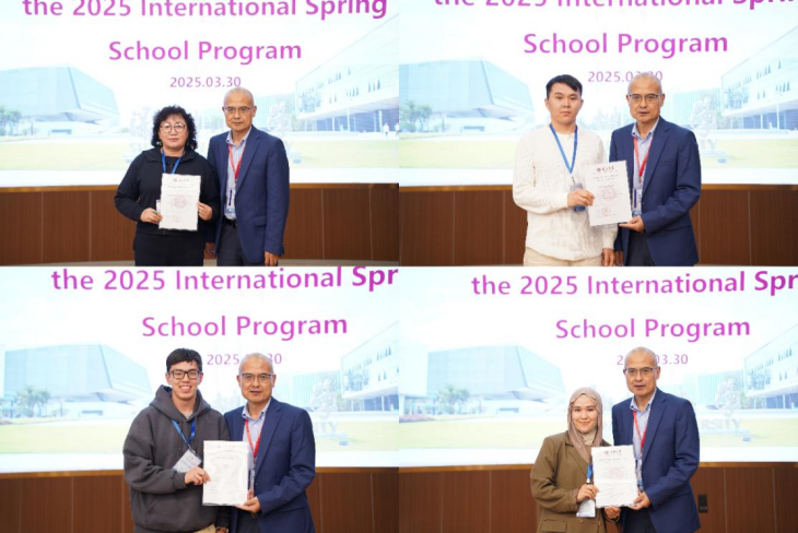 On the afternoon of March 30, following the closing ceremony of szFCFM-2025, the awarding ceremony for the 2025 International Spring School Program was held in Conference Hall D101 of thecampus library.Student representatives enthusiastically shared their experiences of studying and living at SZUforthe past 2 weeks. Professor Xingzhi Xu presented certificates to the participating students.