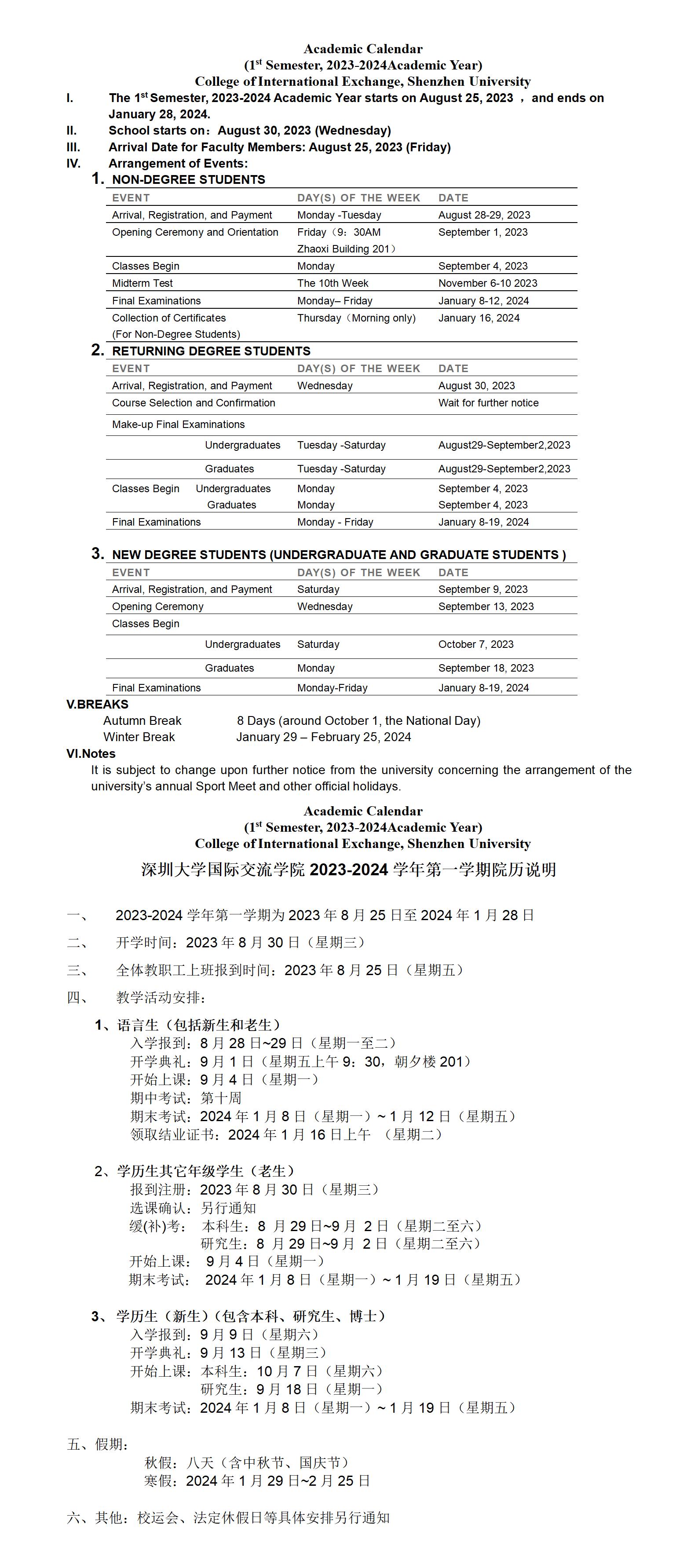 Academic Calendar (1st Semester, 2023-2024 Academic Year)